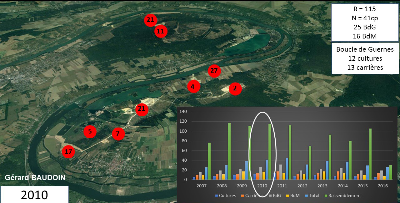 En ce qui concerne la Boucle de Guernes, nous avons ajouté un paramètre concernant le territoire de nidification, à savoir dans des cultures, ou dans des zones de carrières, en cours d’exploitation ou de réaménagement.